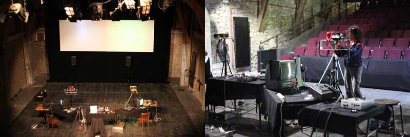 Tous les protagonistes sont sur scènes. Chaque interprète dispose d'un instrument constitué d'une télévision, d'une caméra et d'une table de mixage vidéo bouclées. La matière première du jeu est donc un larsen vidéo généré par la mise en abime de la caméra sur l'écran de télévision via la table de mixage. Ce larsen se traduit par une lumière mise en pulsation dans la boucle. Chaque image ainsi fabriquée est projetée au dessus de chacun des interprètes. Il y a donc autant d'écrans que d'interprètes sur scène. Les tables sont aussi reliées entre elles afin que chacun des interprètes puisse travailler avec les images des autres. Les images sont donc générées et jouées en direct, sans enregistrement préalable.